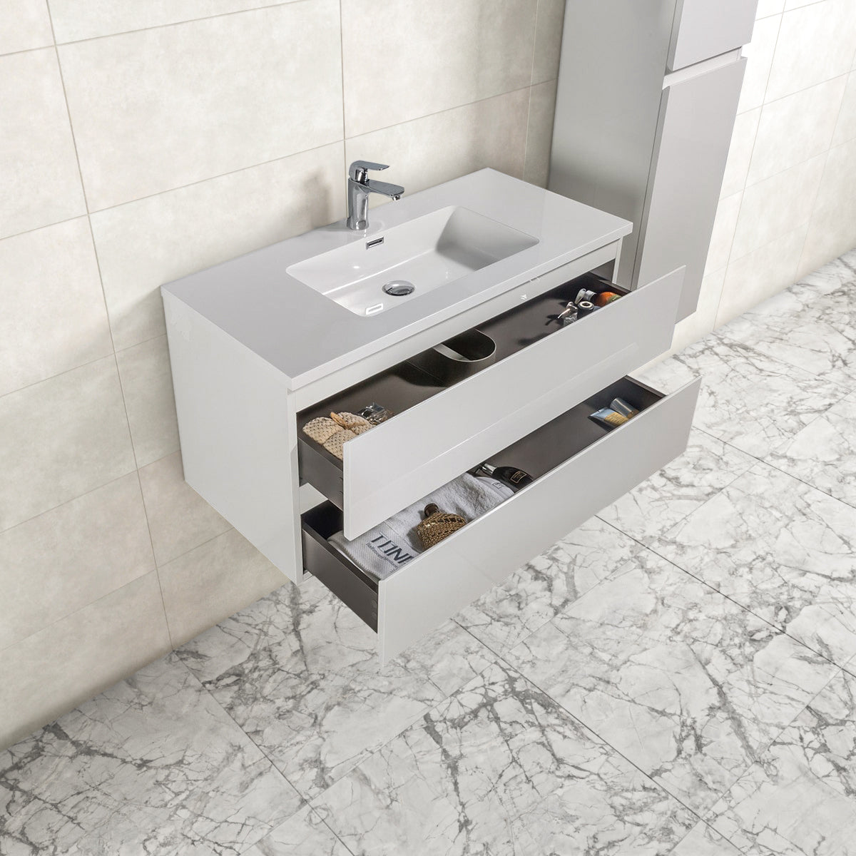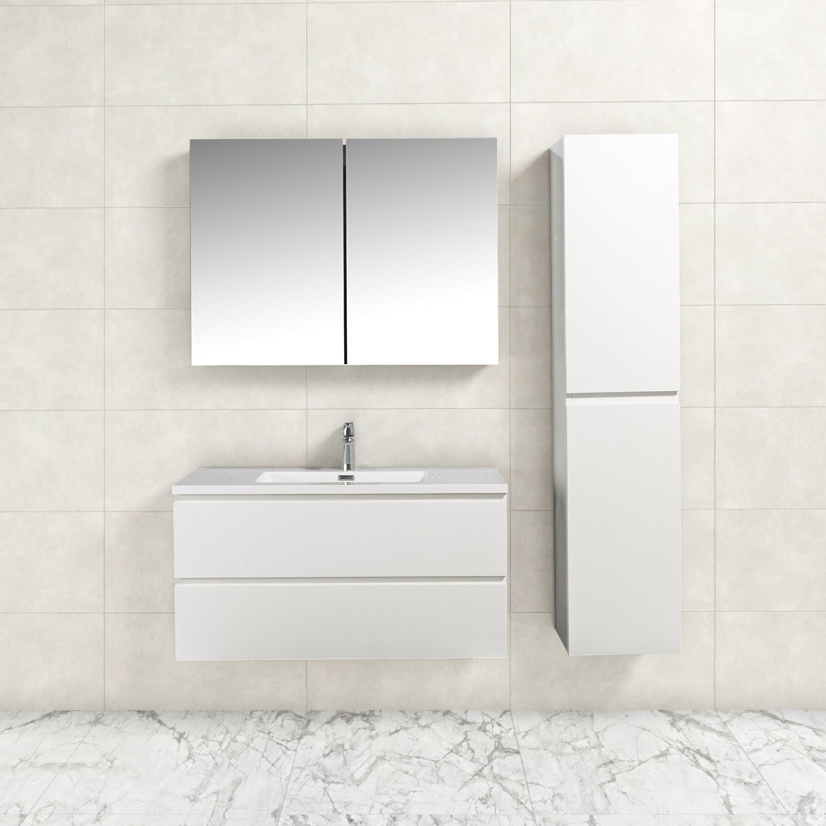 Badkamermeubel Tieme in hoogglans wit 100x50x48cm met witte wastafel.