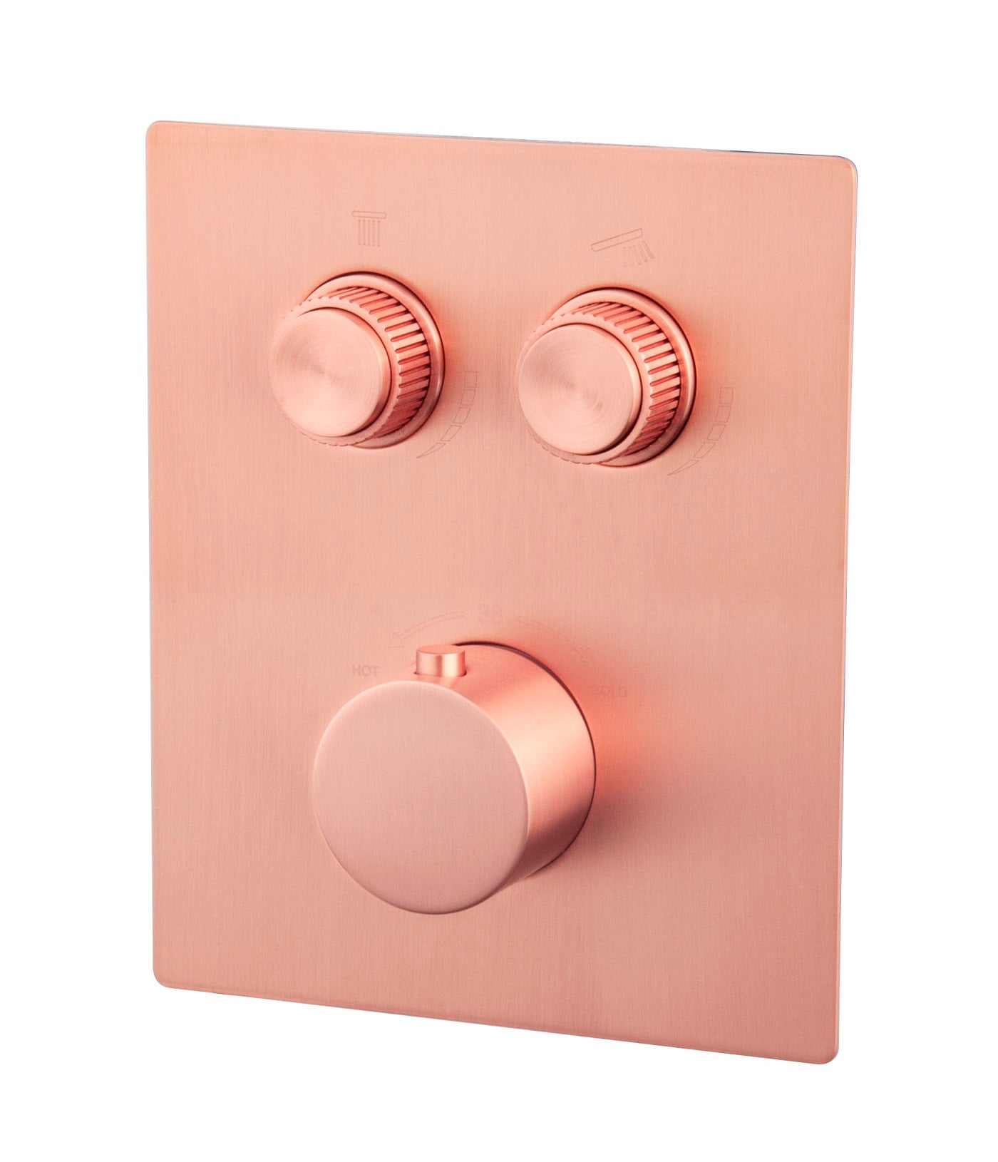 Kies voor luxe en comfort! De Caral Klik Pro is een stijlvolle en hoogwaardige inbouwthermostaat met Smartcontrol. Dit Caral Klik Pro afbouwdeel voor de inbouwthermostaat 2-weg heeft de kleur geborsteld koper en beschikt over 2 functies. Zo kun je eenvoudig in één klik schakelen tussen de handdouche en hoofddouche. Door middel van de Smartcontrol bedieningsknoppen is de mengkraan gemakkelijk aan en uit te zetten. Daarnaast bepaal je door te draaien de gewenste waterdruk. De watertemperatuur is thermostatisch te regelen en heeft een begrenzer op 38°c. Dit maakt dat de kraan ook veilig te gebruiken is door kinderen.
