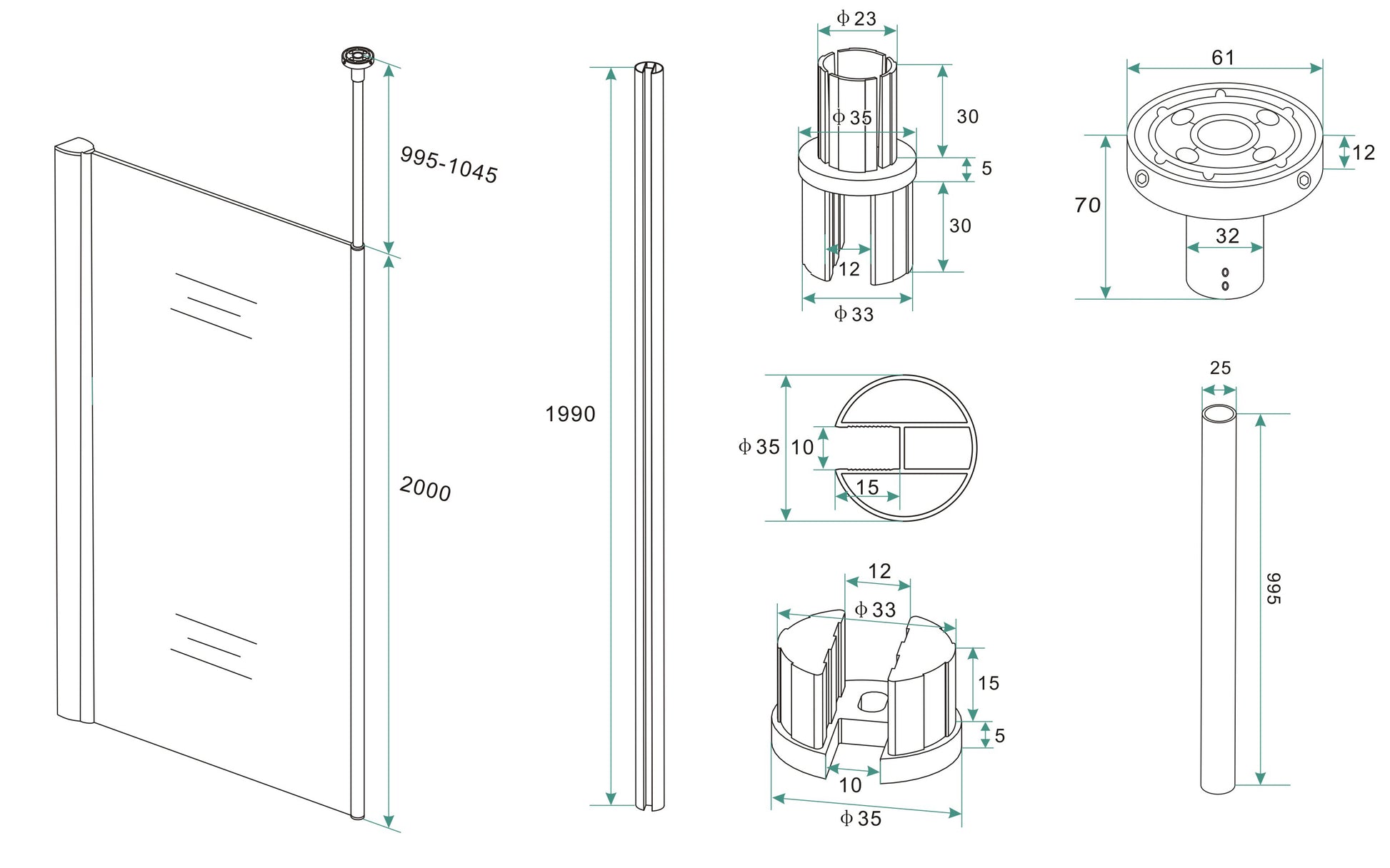 - Lengte glasprofiel: 200 cm.
