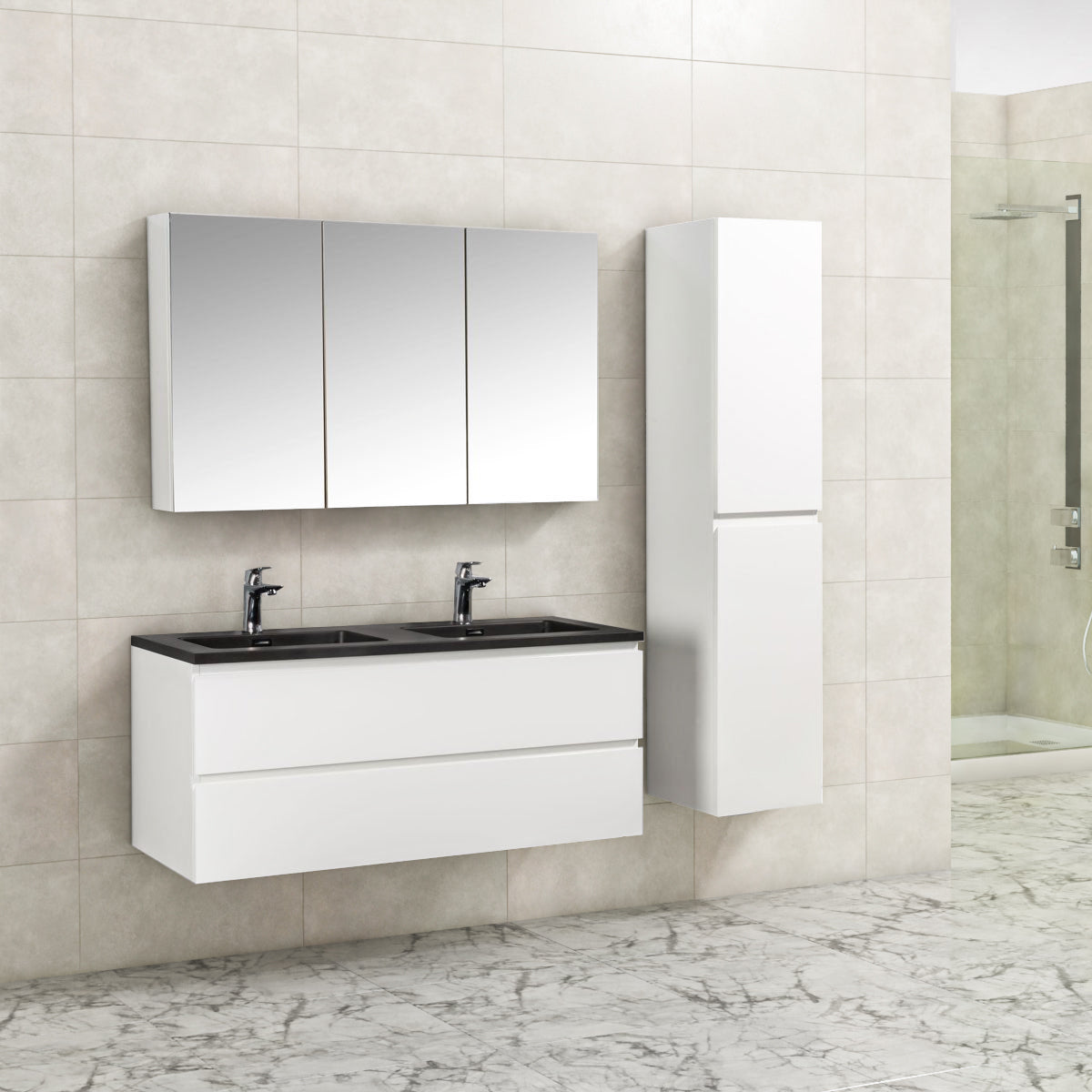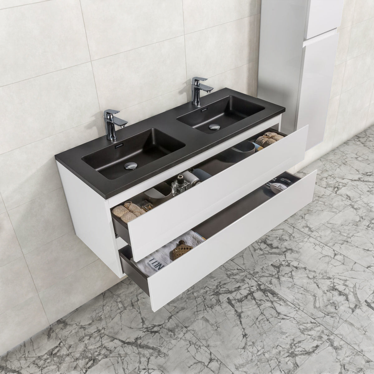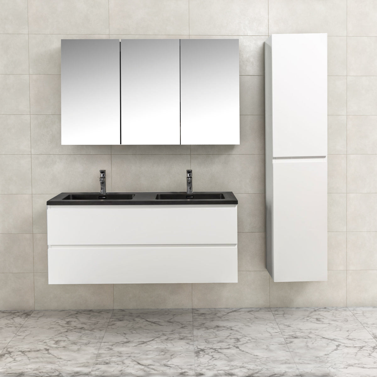Badkamermeubel Tieme in hoogglans wit 120x50x48cm met zwarte wastafel.