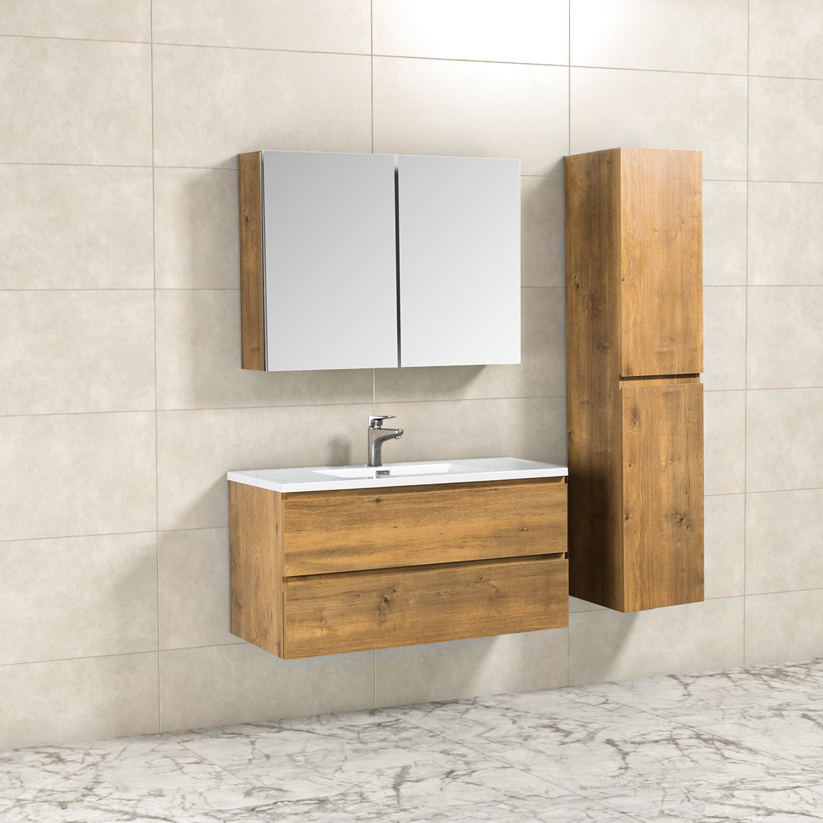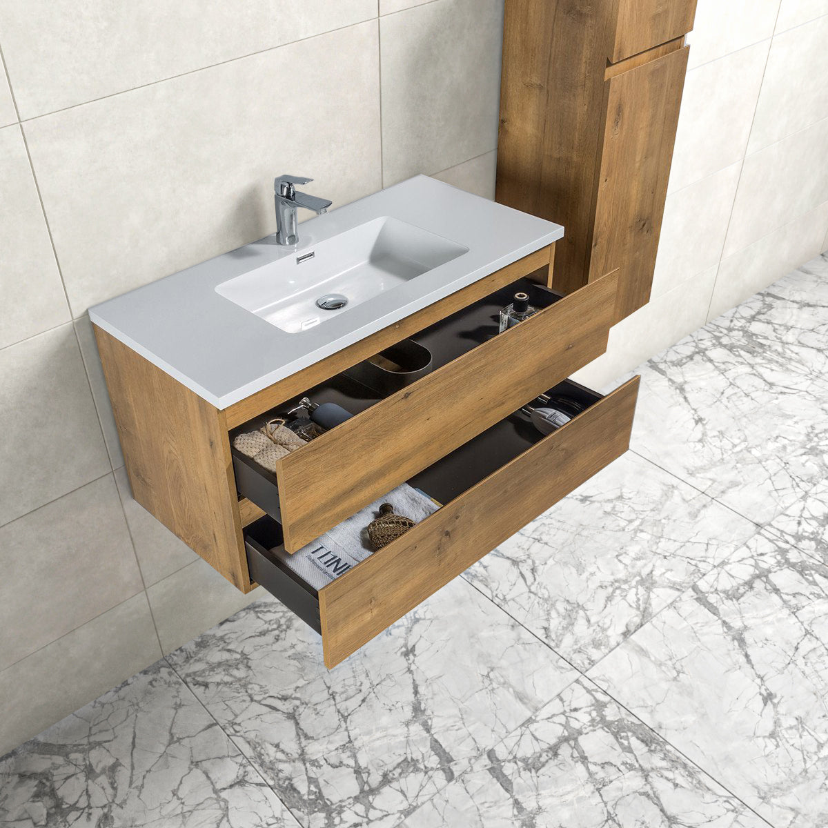 Badkamermeubel Tieme in mat eiken 100x50x48cm met witte wastafel.