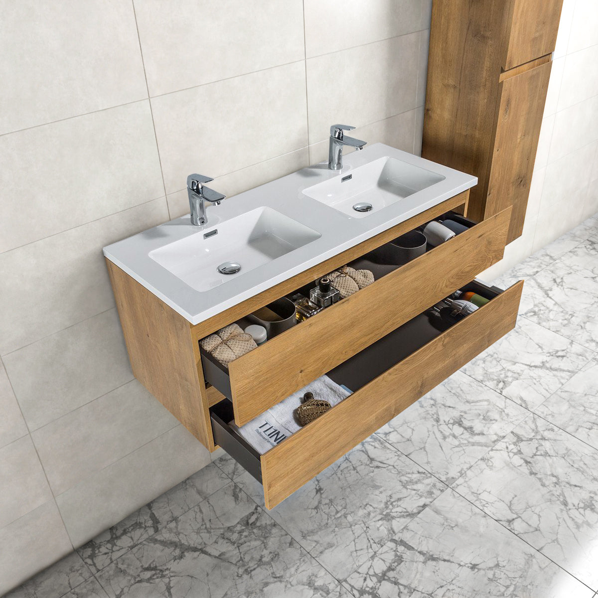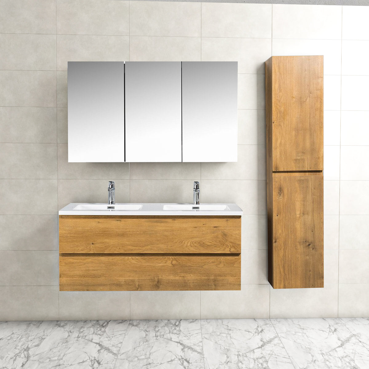 Badkamermeubel Tieme in mat eiken 120x50x48cm met witte wastafel.