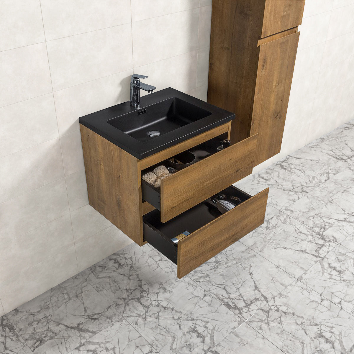 Badkamermeubel Tieme in mat eiken 60x50x48cm met zwarte wastafel.