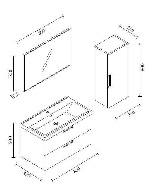 - Afmeting wastafel en onderkast: 80 x 42 x 50 cm. ( breedte x diepte x hoogte )