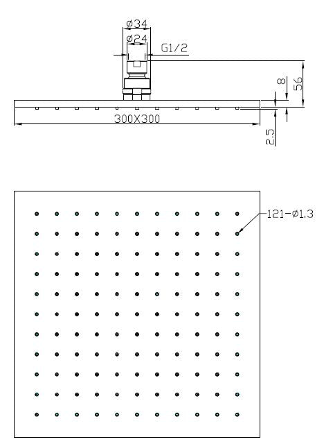 Luxe messing hoofddouche vierkant 30 cm x 0,8 cm chroom.