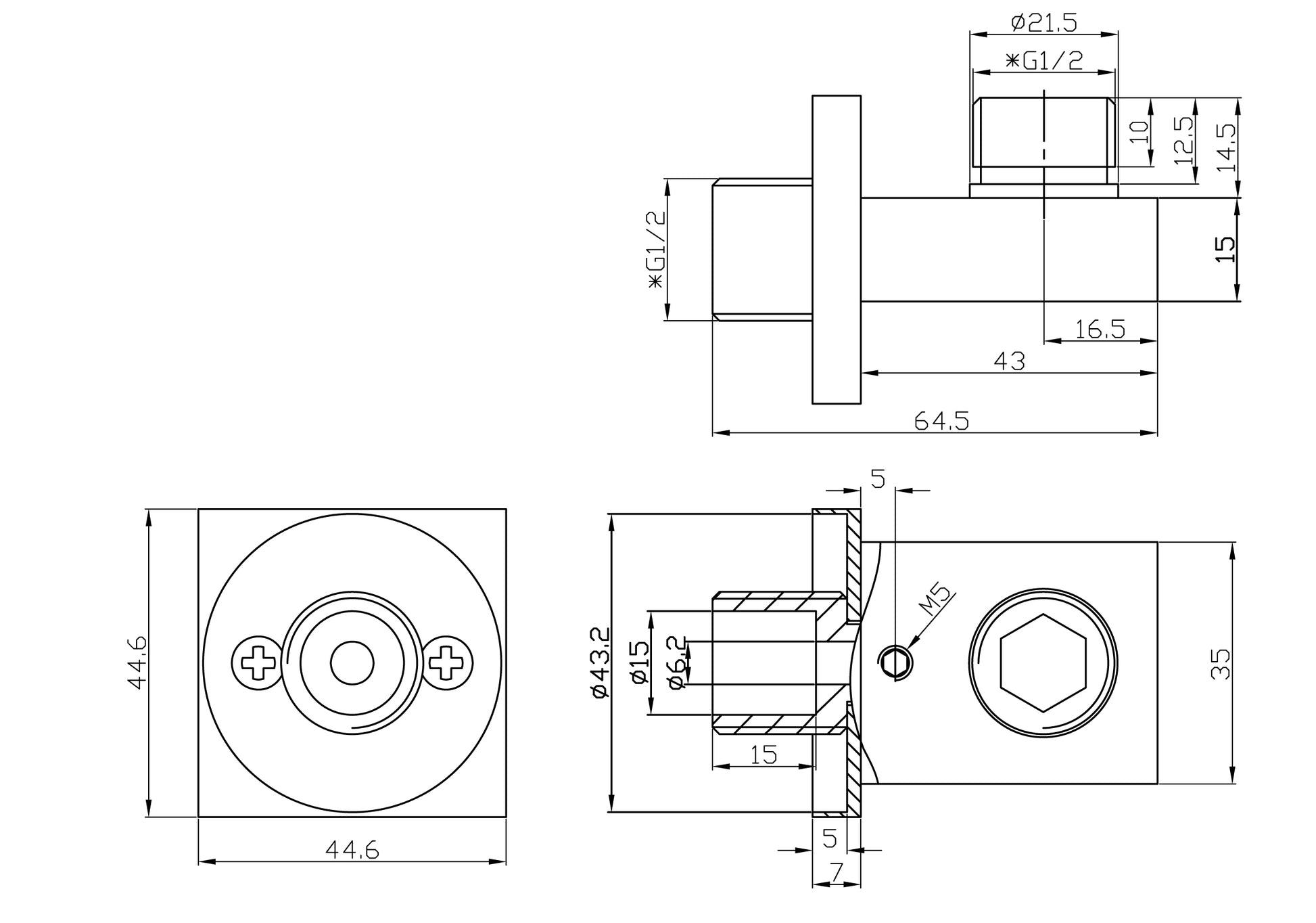 Luxe mess. muur doucheaansluiting vierkant 1/2" geb.staal