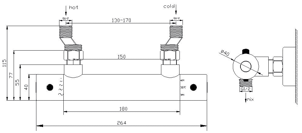 De thermostatische douchemengkranen uit de Rio serie zijn voorzien van een waterbesparende functie en hebben een temperatuurblokkering bij 38°C. Om de temperatuur van het water verder te verhogen moet u de knop van de temperatuurblokkering indrukken. De hartafstand (de maat die gemeten wordt vanuit het midden van de aansluiting) is 12 cm.