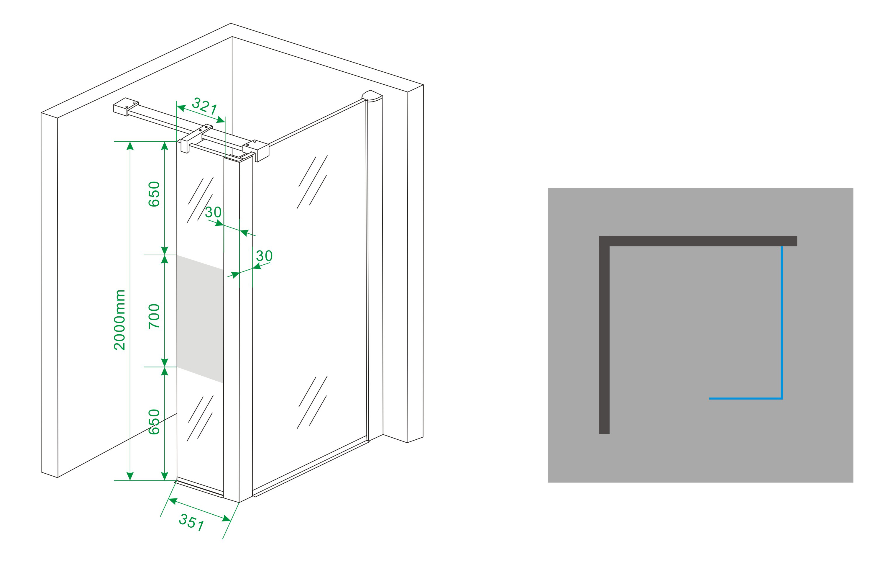 Wiesbaden Zijwand + hoekprofiel 35 x 200 cm Gedeeltelijk mat glas.